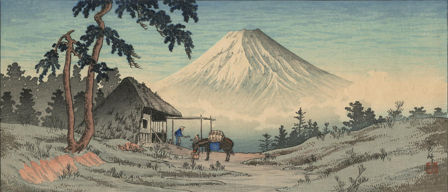 Estampe Japonaise de Okada Koichi, Le Mont Fuji vu de la plage d'Hagomoro