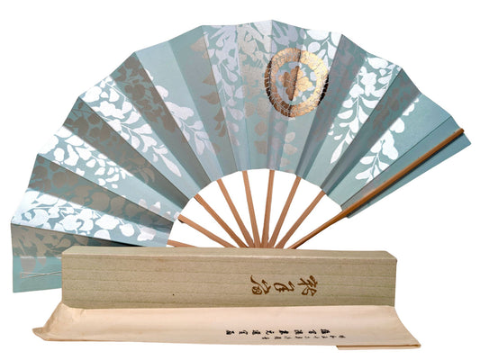 Éventail Japonais traditionnel bleu céladon aux feuilles argentées et blason doré