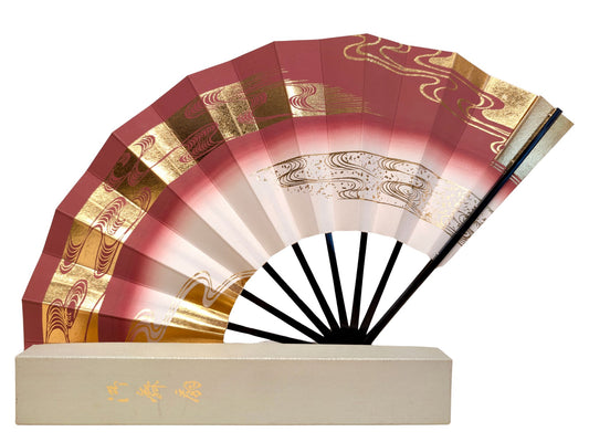 Éventail Japonais vieux rose et doré - motifs de courants d’eau stylisés