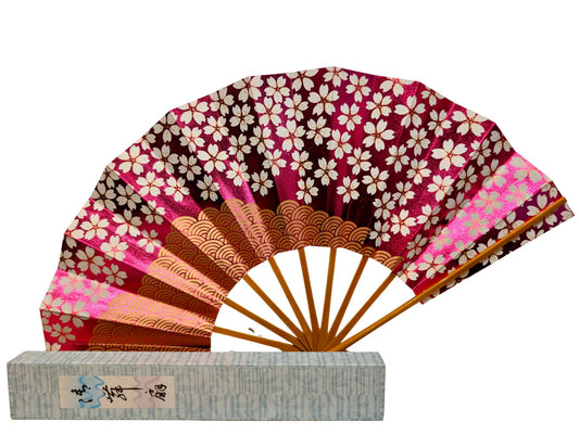Éventail Japonais Sensu - Fleurs de cerisier et vagues d’or sur fond rose brillant