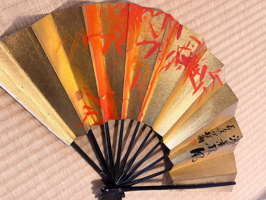 Éventail Sensu Ancien - Bambou Rouge et Calligraphie sur Fond Or