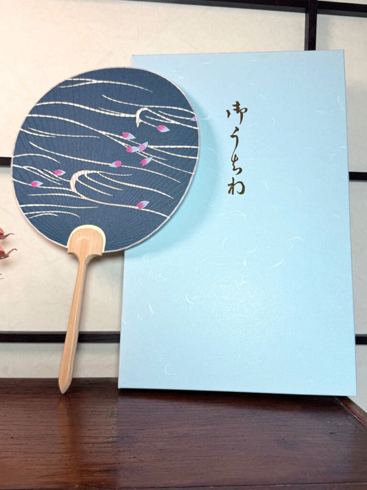 Eventail Uchiwa Contemporain bleu - Pétales de Cerisier sur l'eau