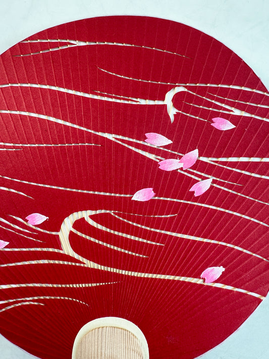 Eventail Uchiwa Contemporain rouge - motif pétales de cerisier