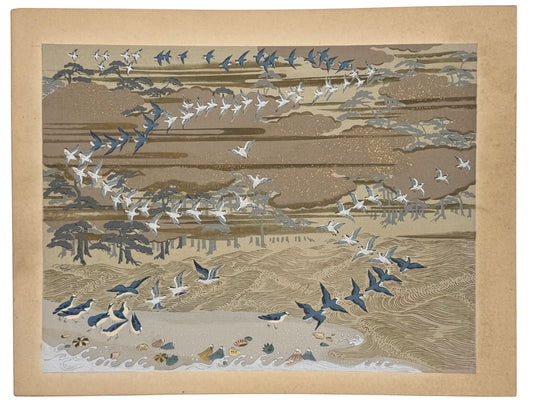 Estampe Japonaise Encadrée Ecole Kano, Envol d'oiseaux sur la plage