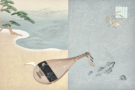 Estampe Japonaise Encadrée de Kojima Gyokuhô, Luth et son Plectre, Dit du Genji, Chapitre 13