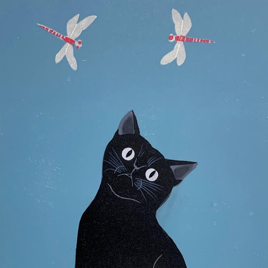 Estampe Japonaise de Nishida, Chat noir regardant deux Libellules