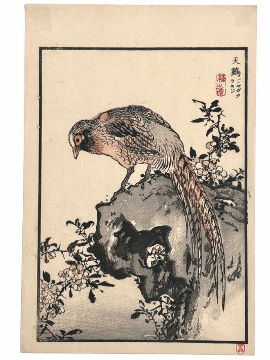 Estampe Japonaise Encadrée de Kono Bairei, Faisan sur un rocher