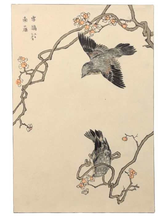 Estampe Japonaise Encadrée de Bunrei Maekawa, Oiseaux et branches tortueuses