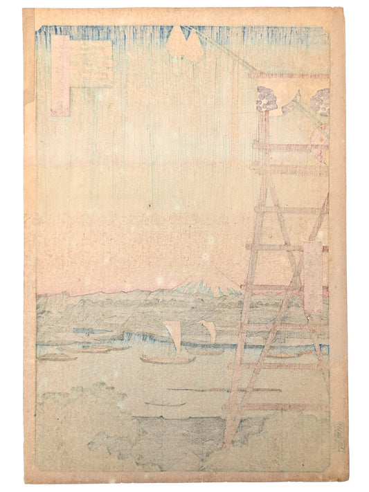 Estampe Japonaise de Hiroshige - 100 vues d'Edo - Pluie sur le pavillon Seidô et la rivière Kanda vu du pont Shôhei