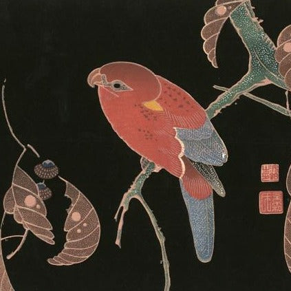 Perroquet rouge sur une branche de chêne de Jakuchu Ito | Reproduction Fine Art