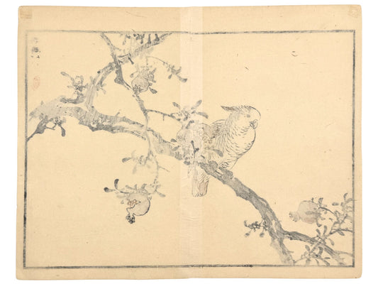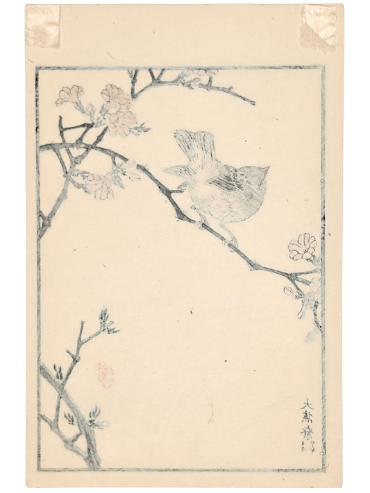 Estampe Japonaise de Kono Bairei, Moineau perché sur une branche en fleurs