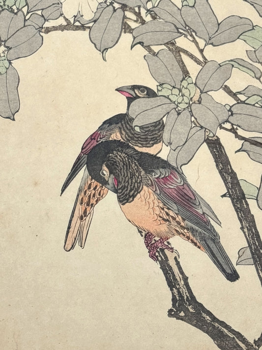 Estampe Japonaise de Imao Keinen | Passereaux et camélia d'automne