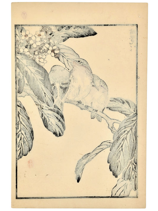 Estampe Japonaise de Kono Bairei, Trois zostérops du Japon lovés sur une branche