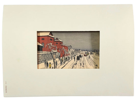 Estampe Japonaise de Yasuji Inoue, La Banque du Japon sous la neige près du pont Eitai
