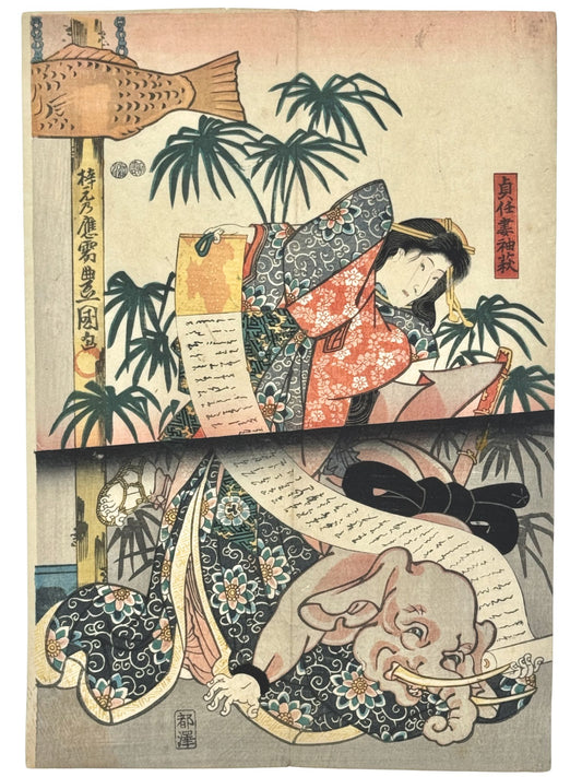 Estampe Japonaise de Kunisada Toyokuni III, Femme et personnage à tête d'éléphant