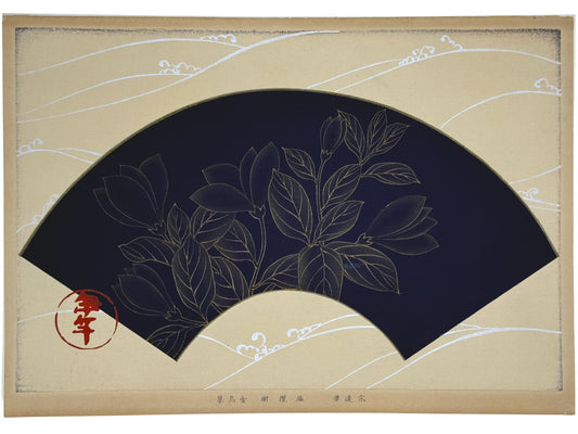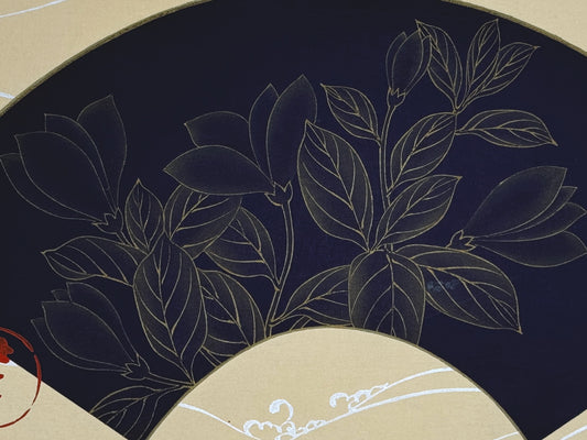 Estampe Japonaise Ecole Rinpa | Fleurs de magnolia sur forme d'éventail bleu nuit