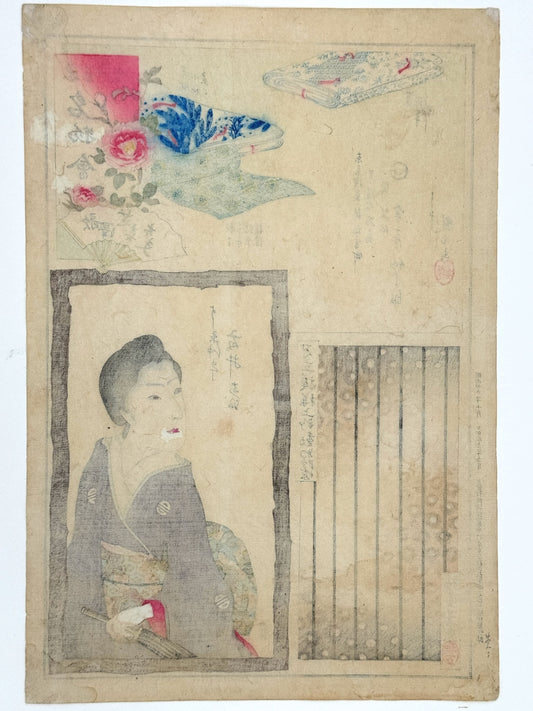 Estampe Japonaise de Kunichika | Marchand de tissus et pivoine