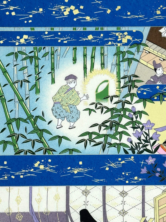 Sérigraphie Japonaise, Conte Princesse Kaguya sur fond bleu