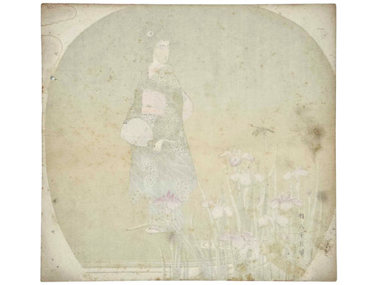 Estampe Japonaise Uchiwa-e - Femme dans un jardin d'iris