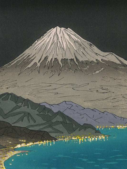 Estampe Japonaise de Okada Koichi, le Mont Fuji vu de Nihondaira la nuit