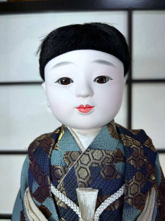 Poupée Japonaise Traditionnelle Ichimatsu, garçon en Kimono traditionnel en soie bleue