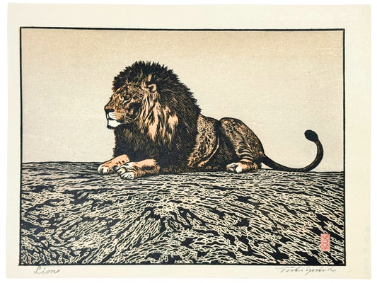 Estampe Japonaise Encadrée de Yoshida Toshi, Lion couché