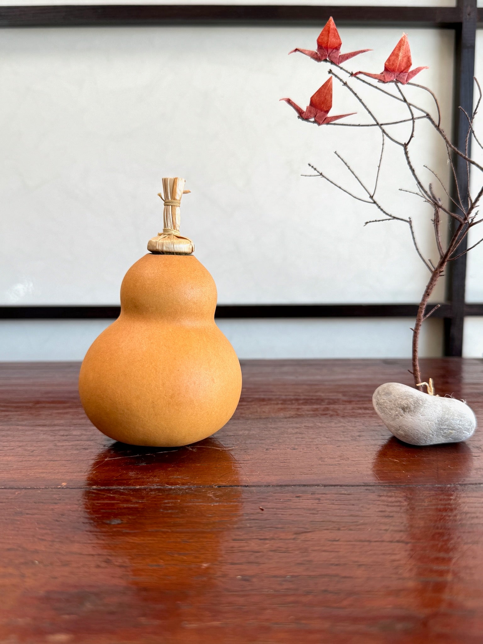 Délicate boite à épices japonaise en forme de coloquinte. Elle a été réalisée à partir du fruit qui a été soigneusement vider et sécher. Son charmant bouchon en forme de queue de fruit tressé de fibres végétales.