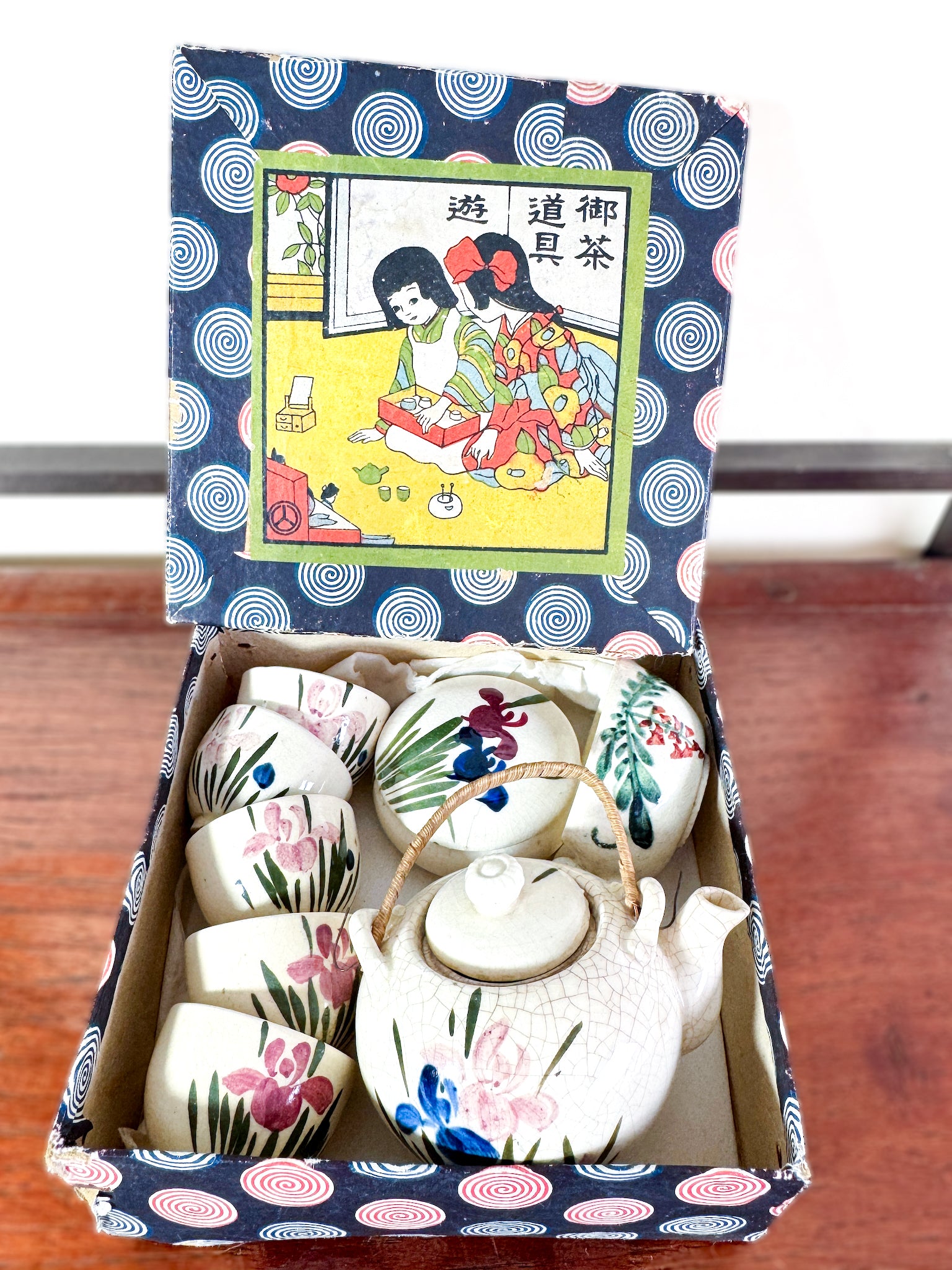 Aujourd’hui, ce service miniature est bien plus qu’un jouet : c’est une pièce d’art populaire japonaise pleine de charme, un bel exemple d’artisanat modeste et sensible. À exposer tel quel ou à utiliser lors d’une mise en scène poétique, il est idéal pour les collectionneurs d’objets japonais vintage, les passionnés de cérémonie du thé, ou tout simplement pour ceux qui aiment les objets doux, délicats et porteurs d’histoire.