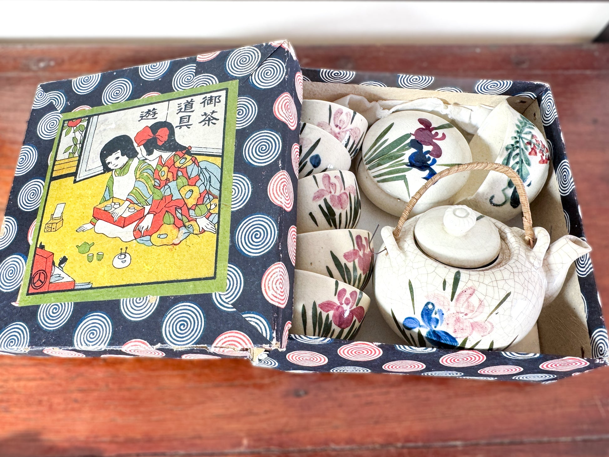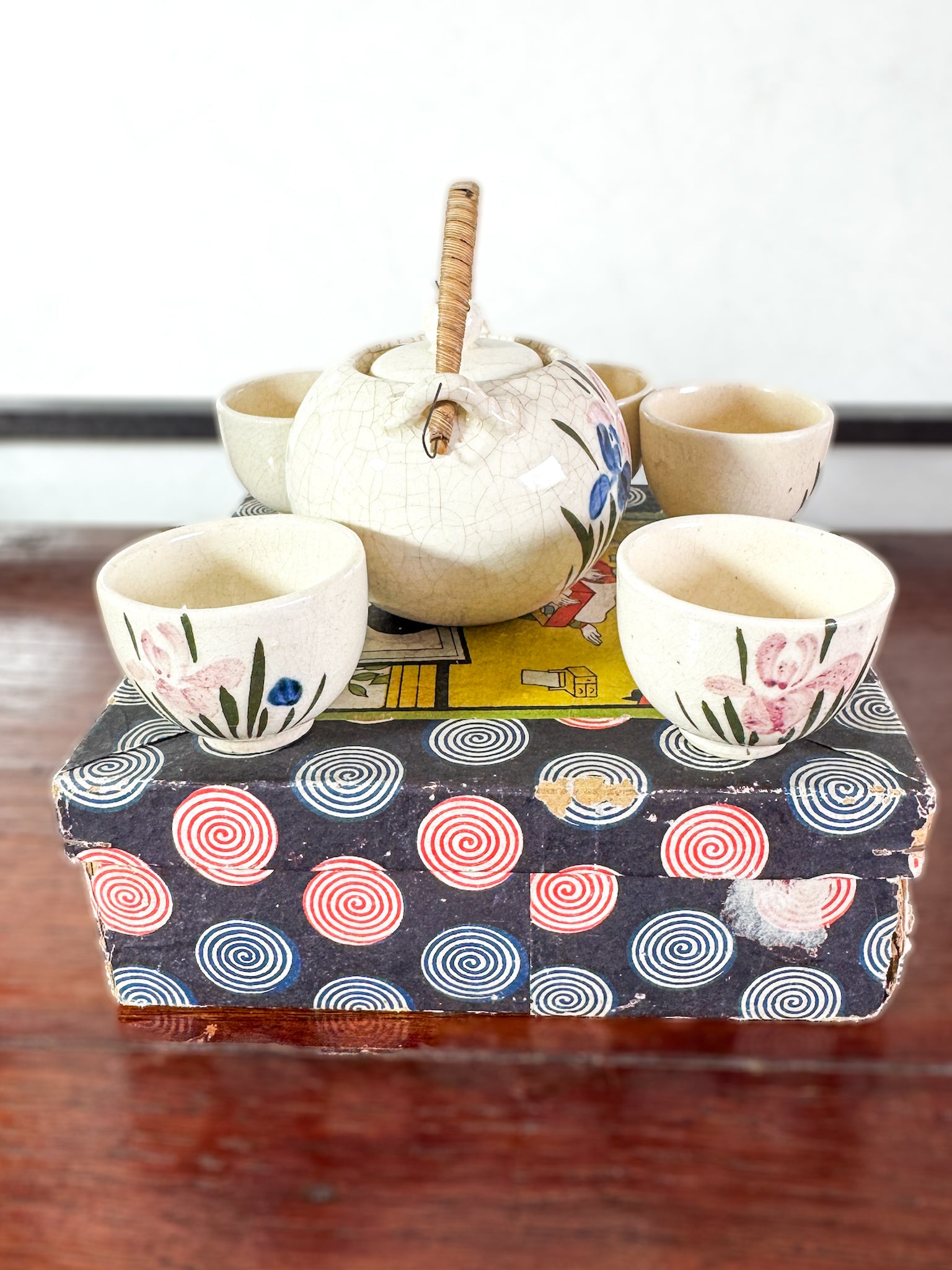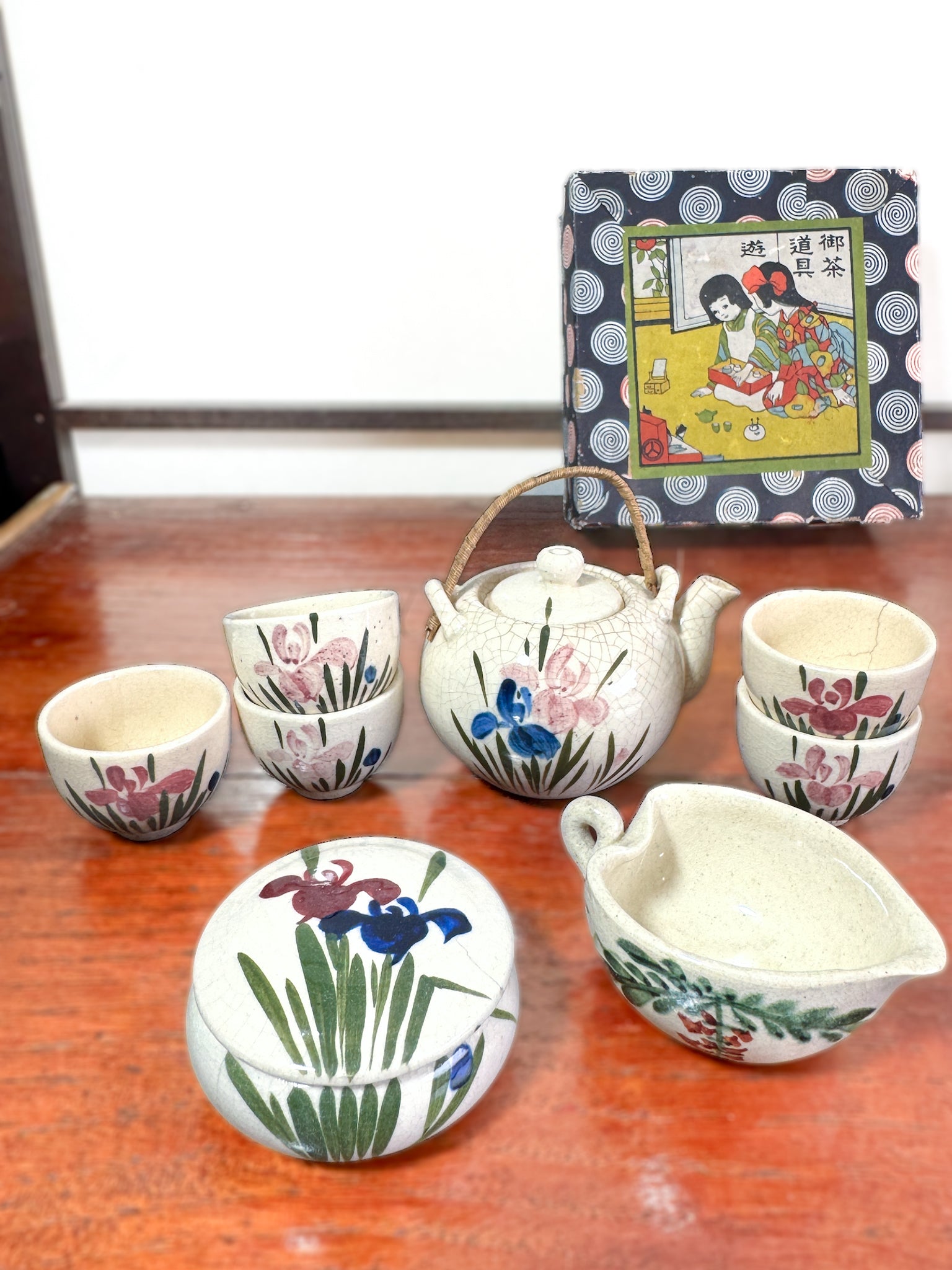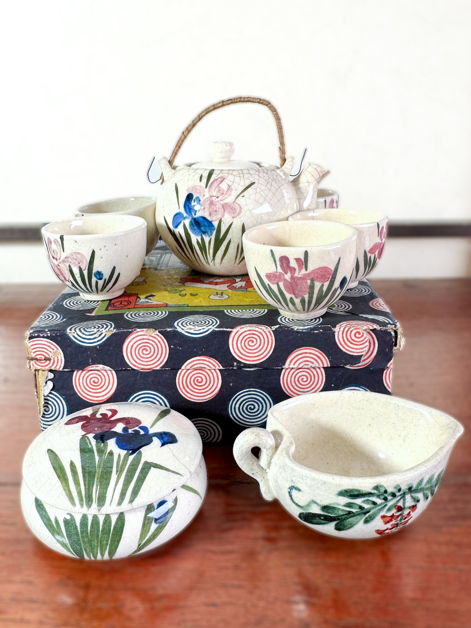 Ce délicieux service à thé miniature vintage se compose de six petites tasses, d'une théière au couvercle assorti, d’un pot verseur et d’une boîte ronde à couvercle, le tout logé dans sa boîte d’origine en carton aux motifs traditionnels de spirales japonaises rouges, blanches et bleues. Chaque pièce, en céramique émaillée, est décorée à la main de motifs d’iris bleus, roses et violets peints avec finesse sur un fond blanc ivoire délicatement craquelé. Le détail du craquelé dans l’émail témoigne de la texture wabi-sabi propre à l’artisanat japonais. La anse de la théière, en osier naturel tressé, complète cet ensemble d’une note rustique et chaleureuse.