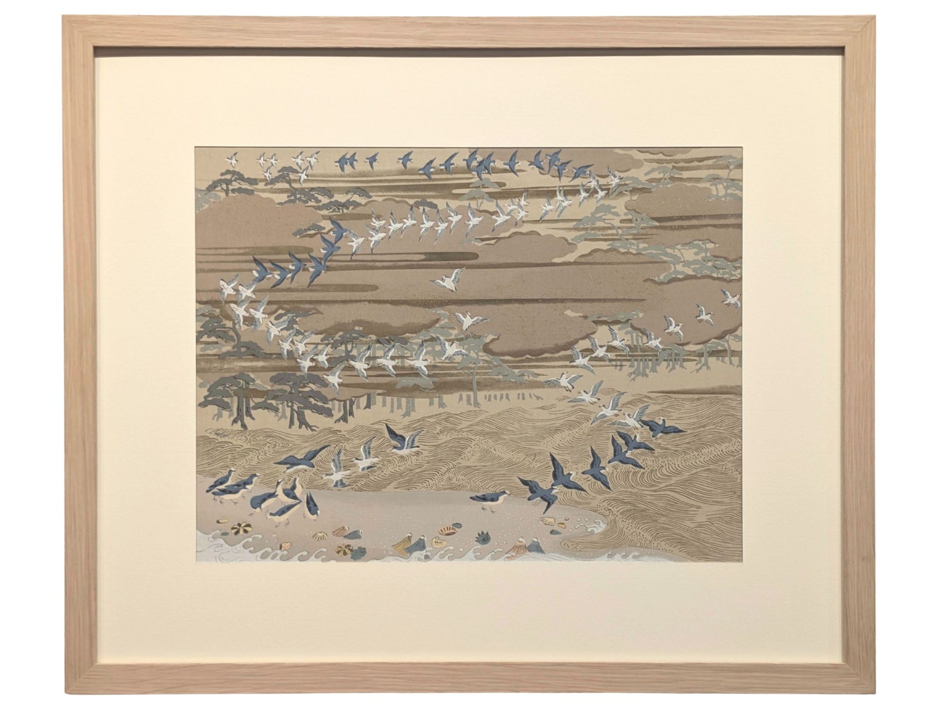 Estampe Japonaise Encadrée Ecole Kano, Envol d'oiseaux sur la plage