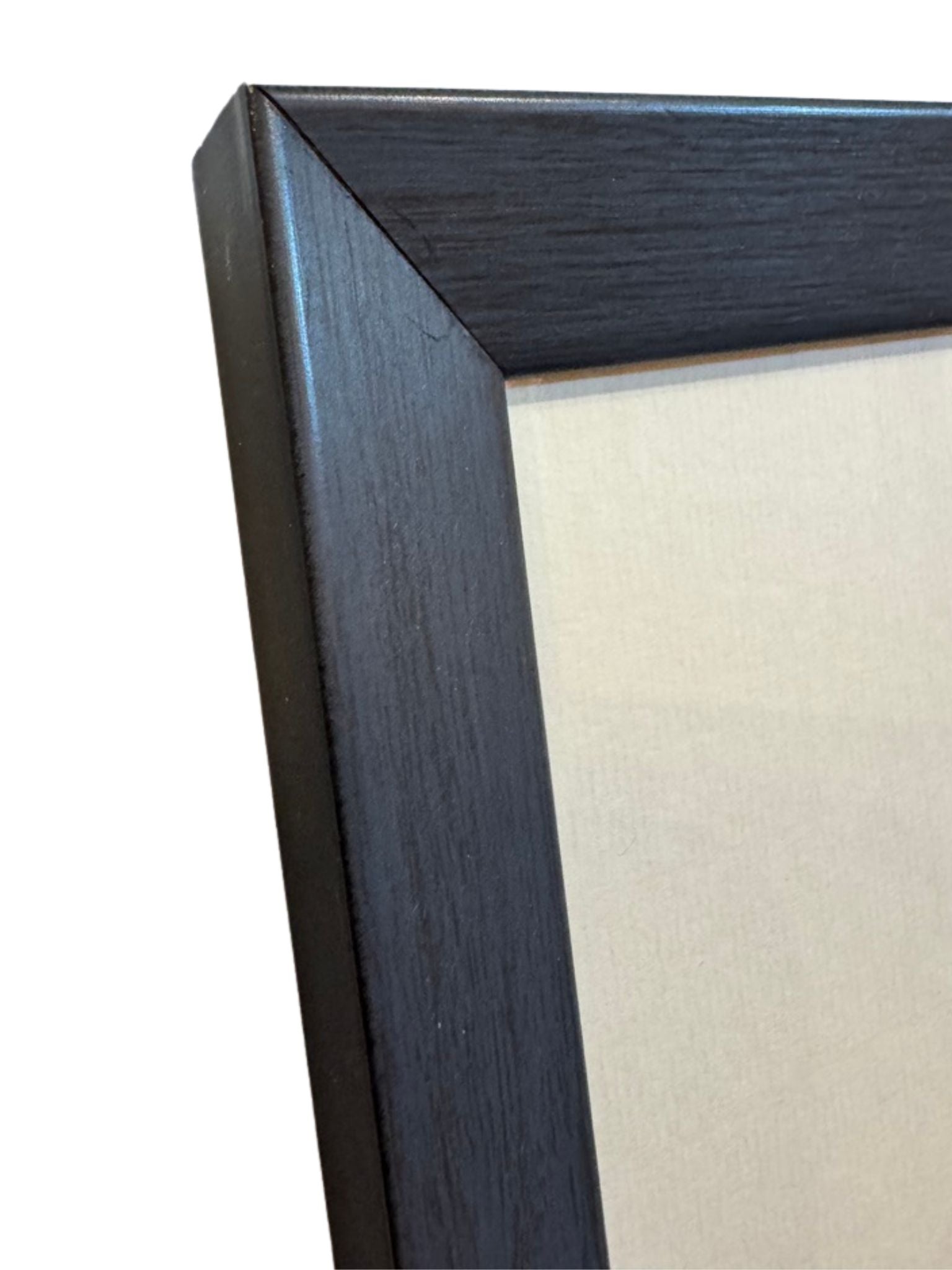 Cette estampe est encadrée avec un cadre en pente grise. Un biseau et passe-partout ivoire ajoute une profondeur à l'estampe. Le verre est un anti-reflet dit invisible et filtre les UV à 70%. Tous les matériaux utilisés pour l'encadrement sont à PH neutres afin d'assurer une conservation optimale de l'oeuvre dans le temps.