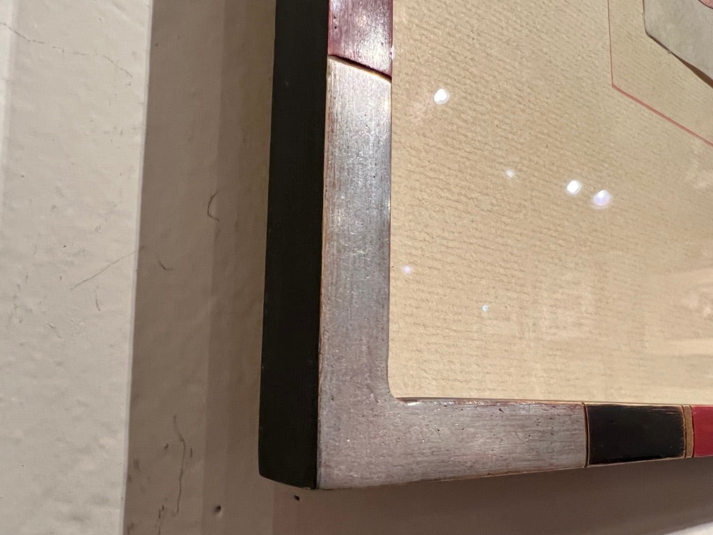 Le cadre à coins rebouché est un plat 10 alternant des bandes rouges et noires séparées par de fines bagues or, avec les angles en argent patiné. Un cadre à la fois raffiné, décoratif tout en restant discret. Une jolie mise en valeur de l'estampe.