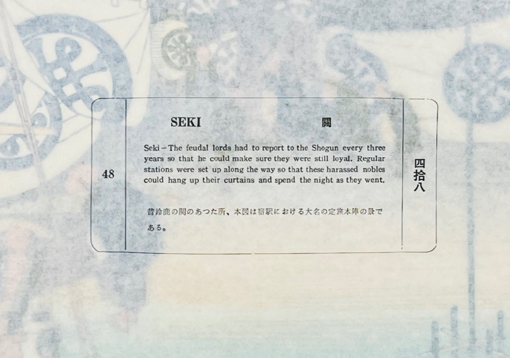 La station de Seki était un relai très important à l'ère Edo, carrefour de plusieurs routes avec celle du Tokaido. On y croisait donc souvent des processions de daimyos (gouverneurs des Provinces) ou de grandes familles de samouraïs devant se rendre tous les deux ans à Edo comme la loi du Shogunat les y obligeait pour y séjourner un an (cette rotation des gouverneurs présents à Edo permettait au pouvoir central du Shogun de contrôler les grandes familles, on l'appelait le sankin-kotai).