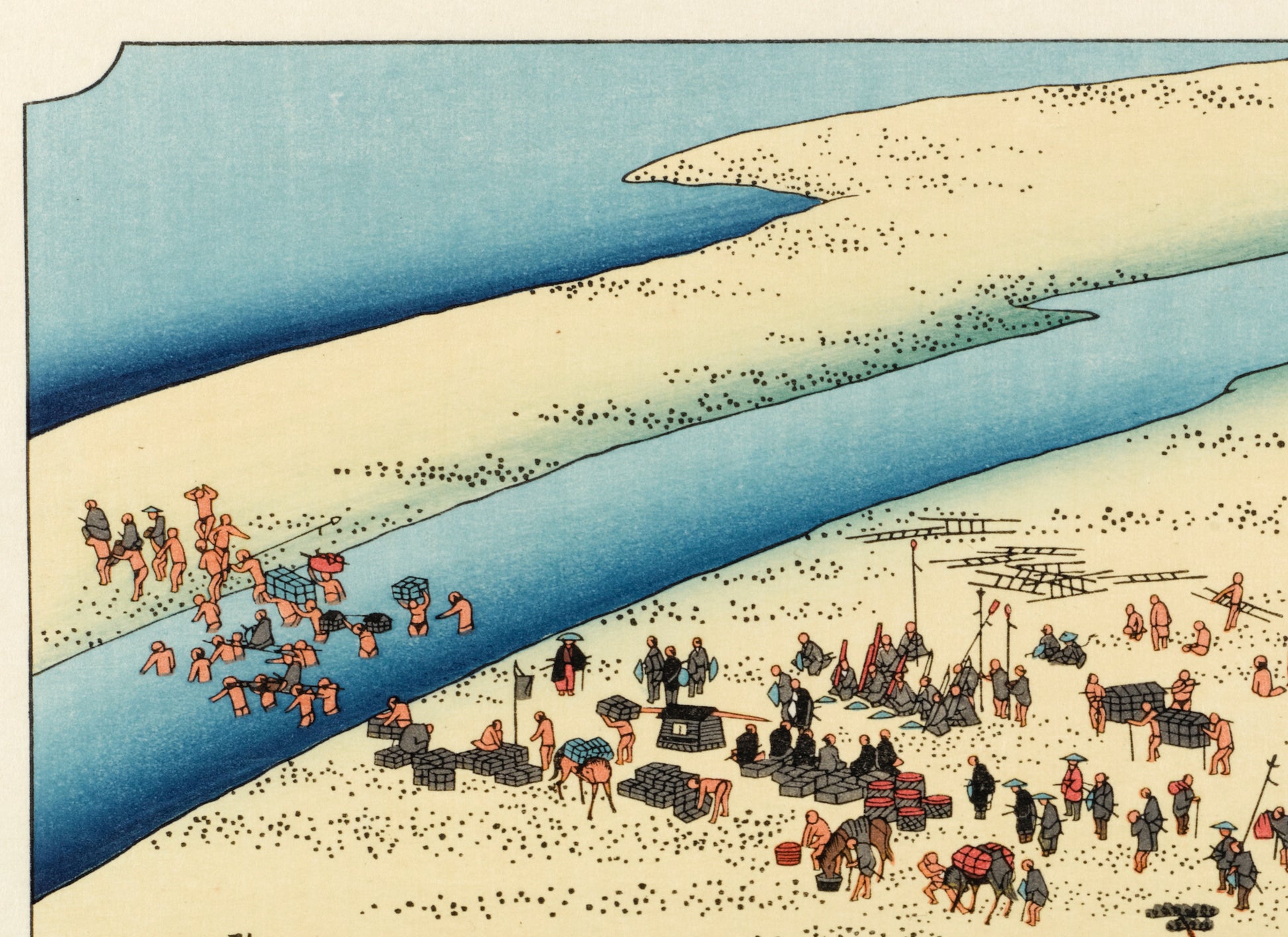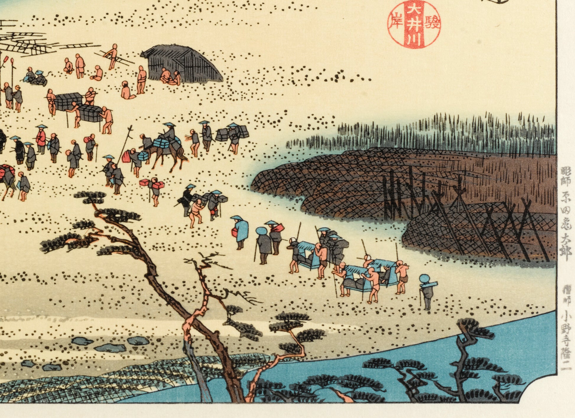 Shimada se situe le long de la rivière Oi, dans la province de Suruga. Le fleuve, la rive, et les hommes la traversant, sont habilement et audacieusement dépeints sans pour autant être le sujet principal de cette estampe. A la fois graphique et riche en détails cette estampe peut être lue de loin et aussi de près pour voir toutes le quotidien des voyageurs et des porteurs.