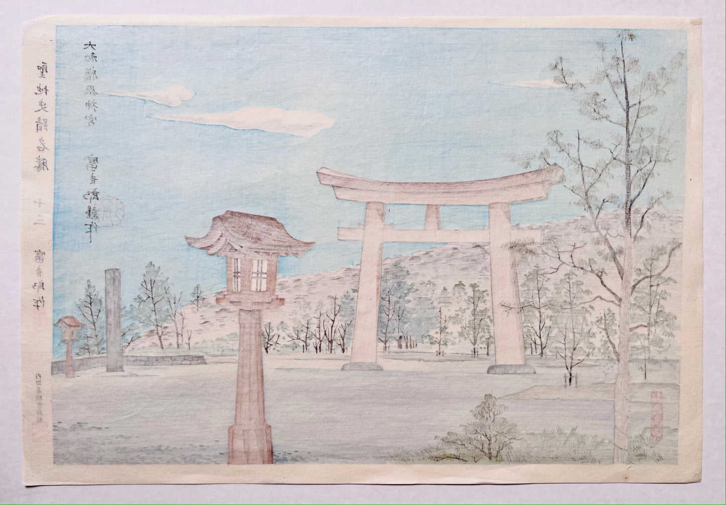Cette estampe du mouvement Sosaku Hanga est la n°13 de la série "Lieux sacrés, historiques, célèbres. (seichi shiseki meisho)". Elle représente le tori du temple Fukuhara à Yamato, ville de la préfecture de Kanagawa qui se situe au centre Ouest de l'Île de Honshû.