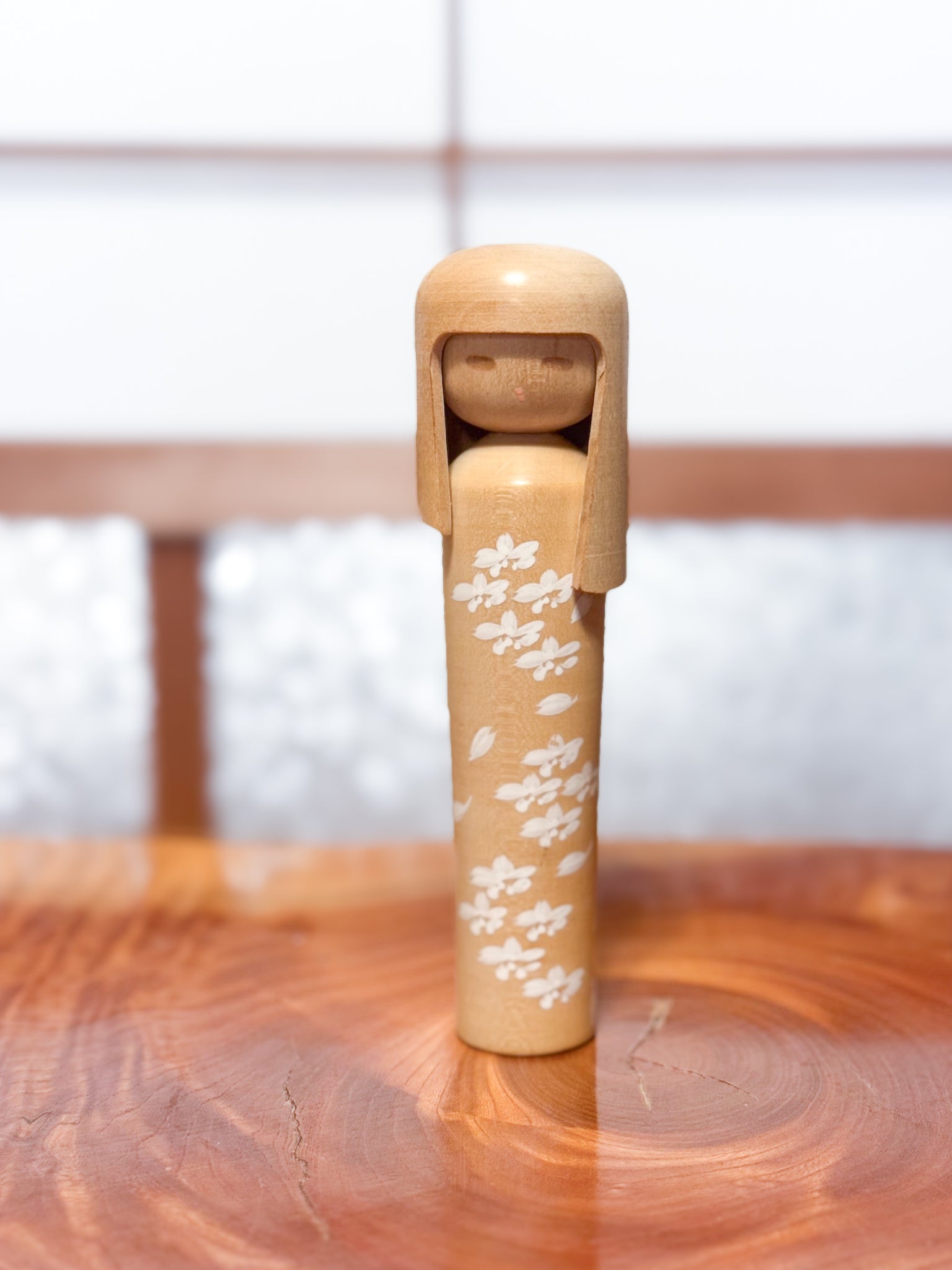 Jolie kokeshi "coeur de fleur" (Hanogoro) de l'artisan Miyajima Muhitsu, décorée d'une multitude de fleurs blanches de cerisier évoquant le printemps..