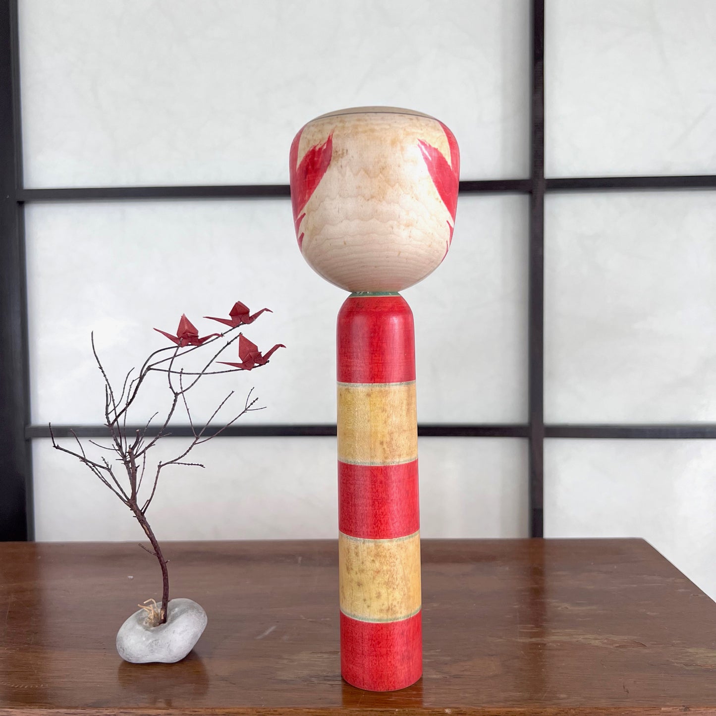 Nos kokeshis sont anciennes et peuvent présenter des marques du temps, cela fait partie de leur charme vintage. Voir les photos.