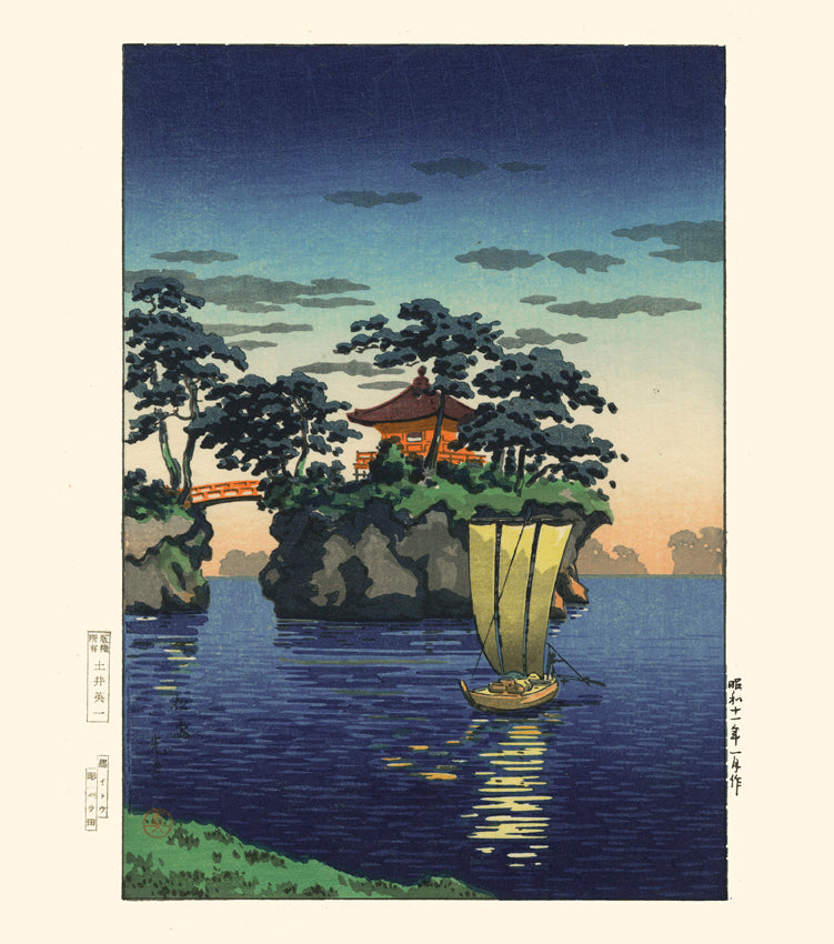 Très belle Estampe de paysage Shin Hanga aux couleurs saturées. Sur les eaux calmes, un bateau passe au pied du sanctuaire Godaido de Matsushima. Koitsu réalise un très beau travail des bleus, contrasté par les délicates touches oranges du temple et du ciel.