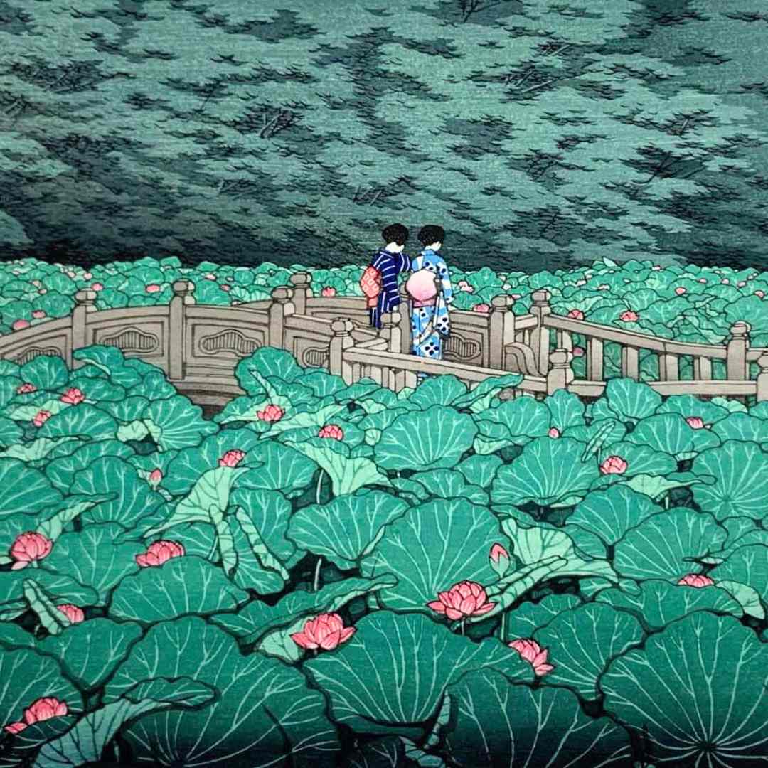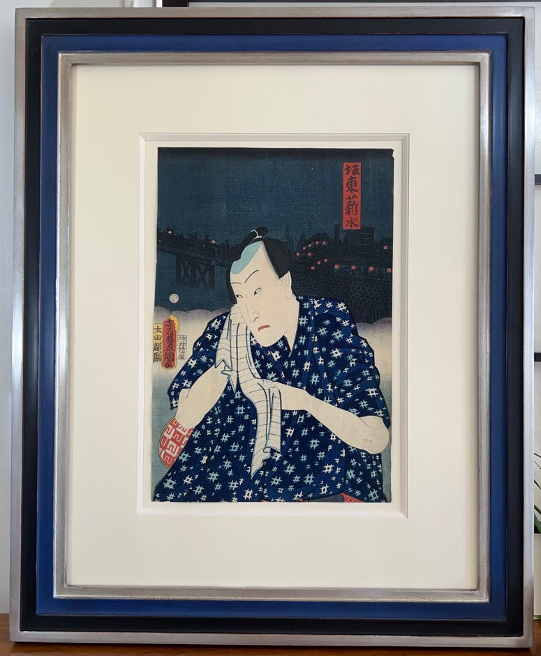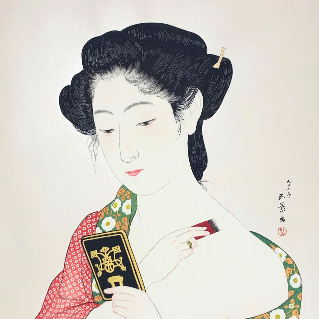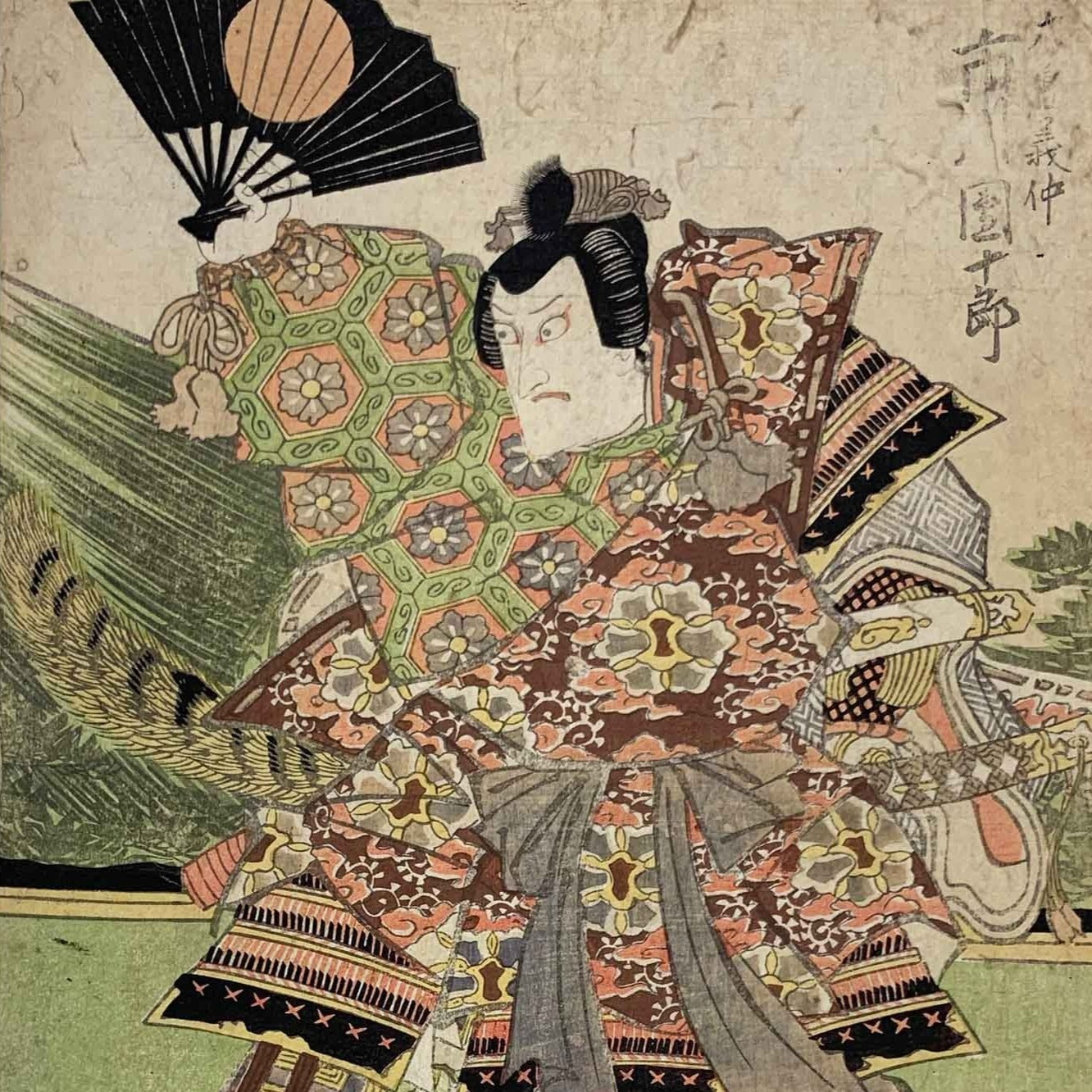 Il porte un élégant chapeau bleu souligné d’un bandeau doré, évoquant le kazaori eboshi porté par les nobles et les divinités dans l’iconographie traditionnelle. La peinture joue subtilement avec les couleurs pastel et les contrastes sombres pour accentuer les traits du visage.