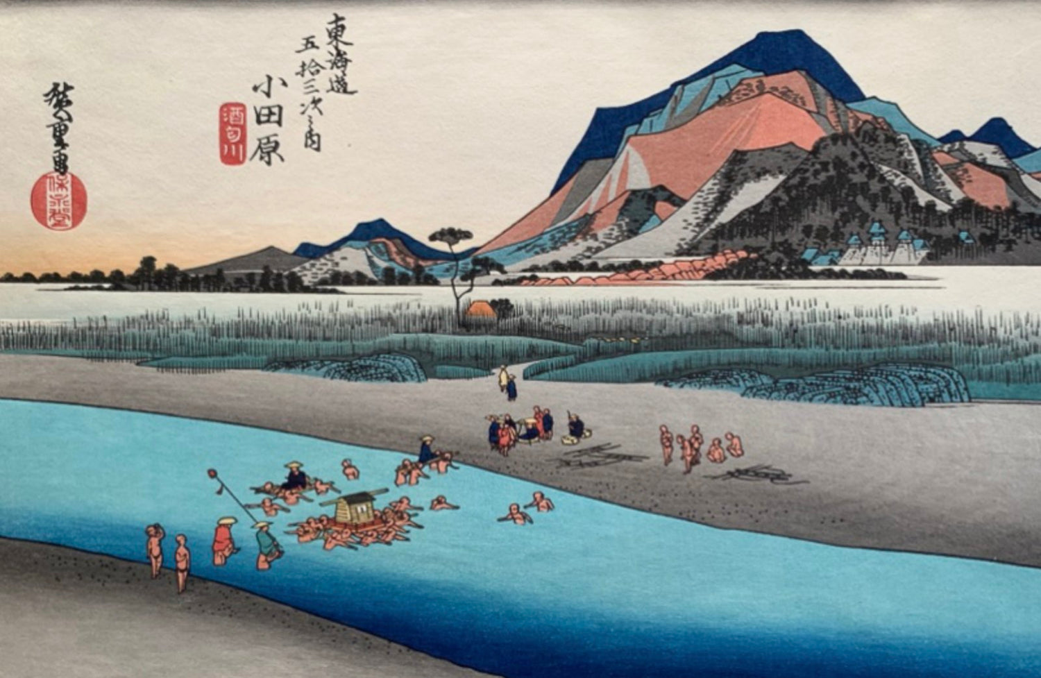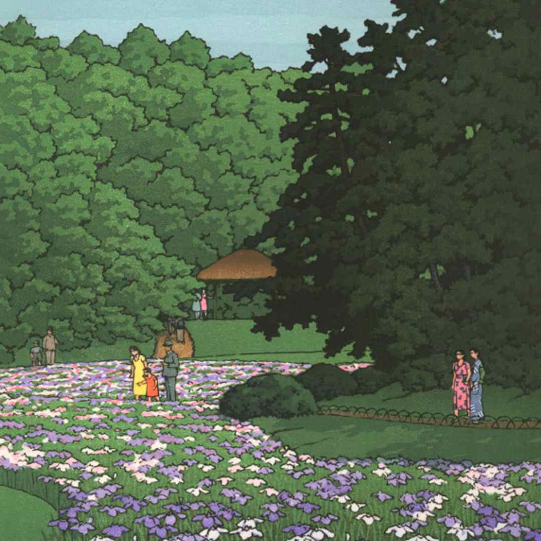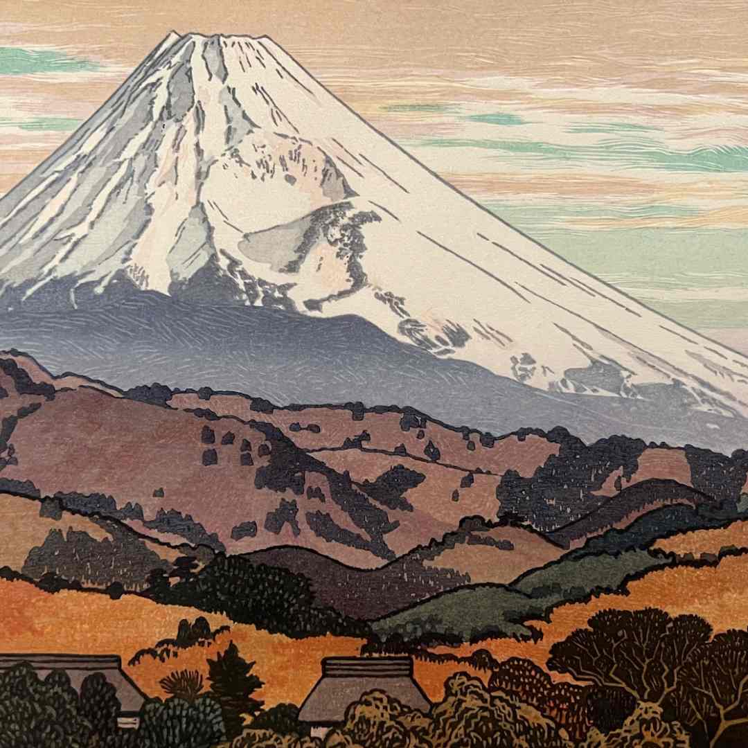 Il porte un élégant chapeau bleu souligné d’un bandeau doré, évoquant le kazaori eboshi porté par les nobles et les divinités dans l’iconographie traditionnelle. La peinture joue subtilement avec les couleurs pastel et les contrastes sombres pour accentuer les traits du visage.