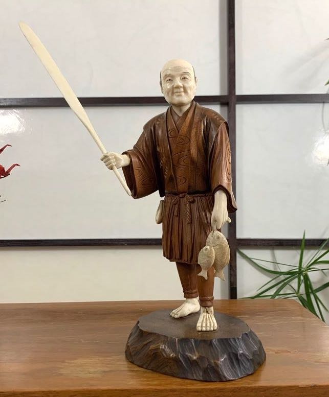 Ce masque japonais en papier mâché représente Ebisu, une divinité bienveillante du panthéon shintō, vénérée comme le dieu des pêcheurs, du commerce prospère et du bonheur. Son visage, délicatement sculpté et peint à la main, exprime une joie paisible, caractéristique des ces divinités protectices.