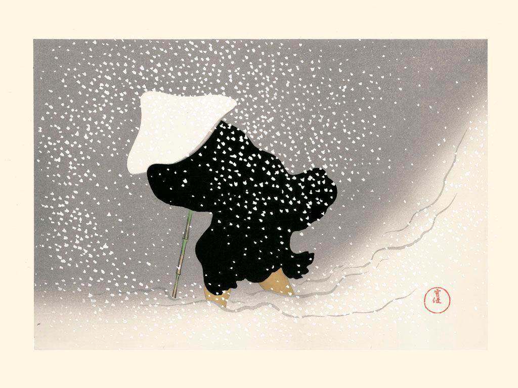 Un moine habillé d’un manteau noir et d’un couvre-chef blanc, s’aidant d’une canne de bambou, traverse une tempête de neige. Il s’agit du moine Nichiren (1222-1282), envoyé en exil sur l’île de Sado durant un hiver impitoyable. Sa silhouette est entourée par une spirale dont le point de départ se situe dans la ligne très mince tracée au coin supérieur droit et se développant vers le sol. La courbe concentrique se poursuit en un tourbillon de flocons, qui font ployer la figure sous le poids de la neige.