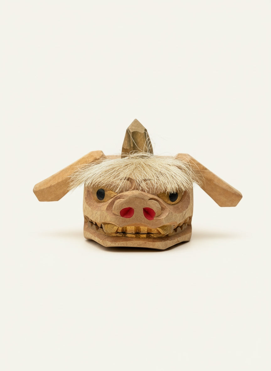 Un pièce pleine de personnalité : un tête de lion japonaise sculptée à la main, qui attire instantanément le regard par ses traits expressifs et son style volontairement brut. Le bois clair, taillé en facettes anguleuses, laisse apparaître un visage vivant, presque malicieux : yeux ronds et perçants, nez rosé, mâchoire entrouverte aux dents dorées… le tout coiffé d’une crinière en crin naturel.